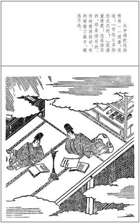 “我还是书生的时候,看到过一个贤女之流的人。这个人就像刚才左马头讲的那人一样,国家大事也谈得来,私人生活、处世之道方面也有高明见解。讲到才学,直教半通不通的博士惭愧无地。不拘谈论何事,总使得对方不得开口。我怎么认识她的呢?那时我到一位文章博士(文章博士是古代官名。)家里去,请他教授汉诗汉文。听说这位博士有好几个女儿,我便找个机会,向一个女儿求爱。父母知道了,办起酒来,举杯庆祝,那位文章博士就即座高吟‘听我歌两途’(白居易《秦中吟》十首之一《议婚》:“……主人会良媒,置酒满玉壶。四座且勿饮,听我歌两途:富家女易嫁,嫁早轻其夫;贫家女难嫁,嫁晚孝于姑。……”)。我同这个女子其实感情并不十分融洽,只因不宜辜负父母好意,也就和她厮混下去。这期间,这女子对我照料得非常周到:枕上私语,也都是关于我身求学之事,以及将来为官作宰的知识。凡人生大事,她都教我。她的书牍也写得极好:一个假名(假名即日本字母。)也不用,全用汉字,措辞冠冕堂皇,潇洒不俗。这样,我自然和她亲近起来,把她当作老师,学得了一些歪诗拙文。我到现在也不忘记她的师恩。可是,我不能把她看做一个恩爱而可靠的妻子,因为像我这样不学无术的人,万一有时举止不端,在她面前现丑,是很可耻的。像你们那样的贵公子,更用不着此种机巧泼辣的内助。我明知此种人不宜为妻,然而为了宿世因缘,也就迁就了。总之,男子实在是无聊的啊!”说到这里,暂时住口。头中将要他快讲下去,催促着说:“啊,这倒真是一个很有意思的女子!”式部丞明知这是捧场,仍然得意扬扬地讲下去: