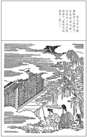 跨下车来。惟光用马鞭拂除草上的露水,走在前面引路。但树木上水点纷纷落下,像秋天的霖雨一般,随从者便替公子撑伞。惟光说:“真如‘东歌’所谓‘敬告贵人请加笠,树下水点比雨密’(此古歌见《古今和歌集》。东歌是东国的风俗歌之意。)了。”源氏公子的裙裾全被露水湿透。那中门从前早就坍损得不成样子,现在竟已形迹全无。走进里面一看,更是大杀风景。此时源氏公子的狼狈相,幸而没有外人看见,还可放心。