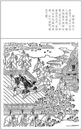 高高的红叶林荫下,四十名乐人绕成圆阵。嘹亮的笛声响彻云霄,美不可言。和着松风之声,宛如深山中狂飙的咆哮。红叶缤纷,随风飞舞。《青海波》舞人源氏中将的辉煌姿态出现于其间,美丽之极,令人惊恐!插在源氏中将冠上的红叶,尽行散落了,仿佛是比不过源氏中将的美貌而退避三舍的。左大将(一说即左大臣。)便在御前庭中采些菊花,替他插在冠上。其时日色渐暮,天公仿佛体会人意,洒下一阵极细的微雨来。源氏中将的秀丽的姿态中,添了经霜增艳的各色菊花的美饰,今天大显身手,于舞罢退出时重又折回,另演新姿,使观者感动得不寒而栗,几疑此非人世间现象。无知无识的平民,也都麕集在树旁、岩下,夹杂在山木的落叶之中,观赏舞乐;其中略解情趣的人,也都感动流泪。承香殿女御所生第四皇子,年事尚幼,身穿童装,此时也表演《秋风乐》舞,此为《青海波》以后的节目。这两种舞乐,可谓尽善尽美。看了这两种表演之后,便不想再看别的舞乐,看时反而减杀兴趣了。