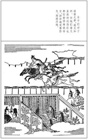源氏太政大臣于未时来到马场殿。果然诸亲王都已到齐。这里的骑射竞赛,方式与朝廷行事不同,近卫府里的中将、少将等都来参加,花样都很新鲜,愉快地玩了一天。女子们对于骑射之事,毫无知识。但她们看见皇族的近侍们也都打扮得鲜艳夺目,拼命地竞赛胜负,颇感兴趣。马场很宽广,一直通到紫姬所居的南院,那里的青年侍女也都出来观赏骑射。竞赛之时,乐队奏《打球乐》及《纳苏利》(《打球乐》是唐乐,《纳苏利》是高丽乐,皆雅乐。)。决胜负时,打钟击鼓。直到天黑,一切都看不见了,方始赛毕。近侍们各按等级领受奖品。到了夜色很深的时候,各人方始散去。