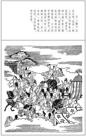 天上撒下点点小雪,使得一路上天空的景色也很艳丽。诸亲王、诸公卿中善于鹰猎(放出鹰去捕鸟。)的人,都预先制备式样新颖的狩猎服装。六卫府(见第4页注2。)中养鹰的官员,其服装更为世人所难得见到:各人各有一种染色的花纹,光怪陆离,异乎寻常。