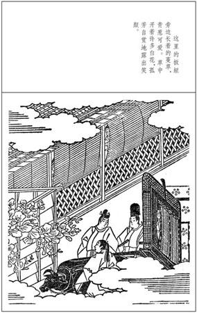 源氏公子所住的地方,是靠边一个房间。他亲自开门,和夕颜一同出去观赏外面的景色。这狭小的庭院里,种着几竿萧疏的淡竹,花木上的露珠同宫中的一样,映着晓月,闪闪发光。秋虫唧唧,到处乱鸣。源氏公子在宫中时,屋宇宽广,即使是壁间蟋蟀之声,听来也很远。现在这些虫声竟像从耳边响出,他觉得有异样之感。只因对夕颜的恩爱十分深重,一切缺点都蒙原谅了。夕颜身穿白色夹衫,罩上一件柔软的淡紫色外衣。装束并不华丽,却有娇艳之姿。她身上并无显然可指的优点,然而体态轻盈袅娜,妩媚动人。一言一语,都使人觉得可怜。真是个异常可爱的人物。源氏公子觉得最好再稍稍添加些刚强之心。他想和她无拘无束地畅谈,便对她说:“我们现在就到附近一个地方去,自由自在地谈到明天吧。一直住在这里,真教人苦闷。”夕颜不慌不忙地答道:“为什么这样呢?太匆促吧!”源氏公子对她立了山盟海誓,订了来世之约,夕颜便真心信任,开诚相待,其态度异常天真,不像一个已婚的女子。此时源氏公子顾不得人之多言了,便召唤侍女右近出来,吩咐她去叫随从把车子赶进门内。住在这里的别的侍女知道源氏公子的爱情非寻常可比,虽然因为不明公子身份而略感不安,还是信赖他,由他把女主人带去。