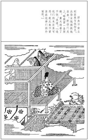 “雨中等待已多时。””(本回题名据此诗。此诗根据催马乐《东屋》,其词曰:“(男)我在东屋檐下立,斜风细雨湿我裳。多谢我的好姐姐,快快开门接情郎。(女)此门无锁又无闩,一推便开无阻挡。请你自己推开门,我是你的好妻房。”参看第127页注2。)