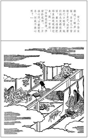 薰大将走到东面的走廊边,看见开着的门口有许多侍女正在低声谈话。他就对她们说:“你们应该知道我是最可亲近的人。女人也没有像我这样可以信托。我虽然是男人,却也能把女人须知之事教给你们。你们会渐渐了解我的心情的,所以我很高兴。”众侍女都默默不能作答。就中有一个名叫弁姐的,是一个熟悉世故而年事较长的侍女,答道:“没有密切关系的人,总是不好意思亲近的。不过世间的事往往相反。就像我,并非对你有密切关系而可以任意不拘地相见的人。然而我们这种厚着面皮当侍女的人,装作怕羞而不理睬你,不是可笑的么?”薰大将说:“你断言对我不必怕羞,我倒又觉得遗憾了。”他向里面望望,但见脱下的唐装堆在一旁,大约正在任情不拘地弄笔。砚台盖里盛着些琐碎的小花枝,看来是她玩耍的。有几个侍女躲进了帷屏后面;另有几个背转了身子,向开着的门口眺望。她们的头发都很美丽。薰大将便把那里的笔砚移过来,题一首诗: