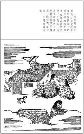 匂亲王骑着马,站在稍远的地方。好几匹声音粗俗的村犬,跑出来向他狂吠,非常可怕。几个随从人都很担心,他们想:“我们人数很少,亲王又打扮得这样微贱,倘使走出几个不分皂白的暴徒来,怎么办呢?”时方只管催促侍从:“快走吧,快走吧!”终于带着她来了。侍从把长长的头发挟在胁下,让发端挂在前面,容姿非常可爱。时方劝她乘马,她一定不肯。时方便捧着她的长裾,替她当跟班。又把自己的木屐给她穿上,自己穿了同来的仆人那双粗劣的木屐。走到匂亲王面前,时方便把情况向他报告。然而这样地站在那里,谈话也很不方便。于是在一所草舍的墙阴下杂草繁茂的地方,铺上一块鞍韂,请匂亲王下马席地而坐。匂亲王自己心中寻思:“我这般模样多难看啊!眼见得此身将毁损在情场中,不能好好地做人了!”眼泪便流个不住。侍从心肠很软,看了他这模样更是不胜悲伤。匂亲王的容姿非常优美,即使是可怕的敌人所变成的鬼看见了,也不忍抛弃。他略微镇静一下,对侍从说道:“难道连说一句话都不行吗?为什么戒备忽然森严起来?想必是有人在薰大将面前毁谤我了。”侍从便把情况详细告诉他,说道:“不久决定了来迎的日子,务请预先妥善地做好准备。我们看到亲王如此不惜尊严,屡次劳驾,即使粉身碎骨,也必设法玉成其事。”匂亲王自己也觉得这样子难看,便不怪怨浮舟一方面了。其时夜已很深,与人为难的群犬不断地狂吠,随从人等把它们赶走。那些守夜人听到了,便拉动弓弦,发出声响。有一个男子怪声怪气地叫喊:“火烛小心!”匂亲王非常慌张,只得命驾返京,此时他心中的悲伤自不必说。对侍从吟道: